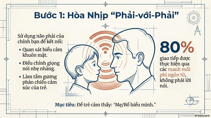 Để hòa nhịp với não phải của con bạn, hãy kết nối với con bạn bằng cách sử dụng não phải của chính bạn, thứ ghi nhận những manh mối về cảm nhận của đứa trẻ thông qua biểu cảm khuôn mặt, chuyển động và giọng nói (những năng lực đặc biệt của não phải). Đây được gọi là hòa nhịp phải-với-phải. Tám mươi phần trăm giao tiếp được thực hiện bằng những manh mối ngoài-tầm-ý-thức này, chứ không phải lời nói.