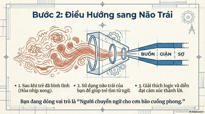 Phần não trái có thể thấu hiểu và diễn đạt bằng lời những gì mà phần não phải cảm xúc đang trải nghiệm. Nếu một đứa trẻ bị bao trùm bởi cảm xúc, nó sẽ chỉ vẫy vùng và chìm ngày càng sâu vào tình trạng nghi ngờ bản thân và sự hỗn loạn, trừ phi ai đó giúp nó. Vì thế, khi con bạn đang phải vật lộn về mặt cảm xúc, chính bạn sẽ là người giúp nó tìm ra những từ ngữ để diễn tả và thấu hiểu những cảm xúc ấy. Giống một người chuyển ngữ cho một cơn bão cuồng phong.