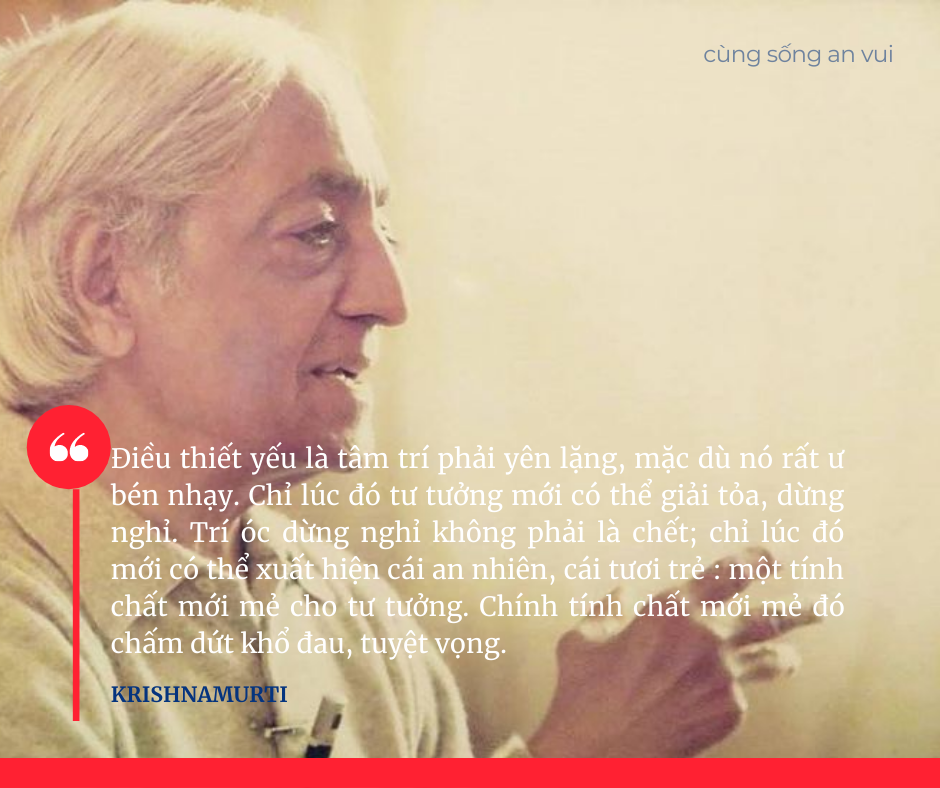 Hành động của trí óc chính là phi hành động (bó tay, bất lực) trong sự đuổi bắt chính nó ; sự cải thiện của nó luôn luôn kêu gọi những sự cải thiện khác. Nó bị kềm giữ bởi chính hành động cũng như phi hành động của nó. Không bao giờ trí óc ngủ im, và những giấc mộng của nó đều do tư tưởng đánh thức. Dù trí óc có năng động, cao thượng hay hèn mạt, nó vẫn luôn luôn nhỏ hẹp. Tính nhỏ hẹp của trí óc không chấm dứt được. Trí óc không thể trốn chạy chính nó ; đức hạnh của nó cũng ty tiện như đạo đức của nó. Nó chỉ có thể làm được một việc duy nhất : tuyệt đối hoàn toàn im lặng. Im lặng này không phải là ngủ quên, cũng không là biếng nhác. Trí óc thì bén nhậy, và để giữ nó đừng phản ứng quen thuộc theo kiểu tự vệ, đừng quen thói phán đoán, kết án hay tán dương, điều duy nhất mà trí óc có thể làm được là tuyệt đối im lặng, có nghĩa là duy trì một tình trạng từ bỏ, phủ nhận toàn bộ những hoạt động của nó và ngay cả chính nó. Trong trạng thái phủ nhận này, trí óc không còn nhỏ hẹp ty tiện nữa ; lúc đó nó không còn cố thu gom để thành công, tự thành tựu, trở thành. Trí óc lúc đó là chính nó : tự động, sáng tạo, tính toán, tự vệ. Một chiếc máy toàn hảo không bao giờ ty tiện, máy sẽ tuyệt vời khi nó vận hành ngay tầm mức của nó. Như mọi loại máy, trí óc cũng hao mòn và liệt chết. Trí óc trở nên tự tiện khi nó sử dụng để học hỏi cái bất tri, cái vô lượng. Chức năng hoạt động của nó nằm trong cái hữu tri, nó không thể hoạt động trong cái bất tri. Những sáng chế của nó ở trong phạm vị hữu tri, nó sẽ không bao giờ nắm bắt được sự sáng tạo của cái bất khả tri, dù cho dùng đến ngôn ngữ hay nghệ thuật. Trí óc không thể biết đến chơn mỹ. Chỉ trong lặng im tuyệt đối, vô ngôn, một sự vô hành không tạo tác, không chuyển động, thì cái bao la vô hạn mới xuất hiện.