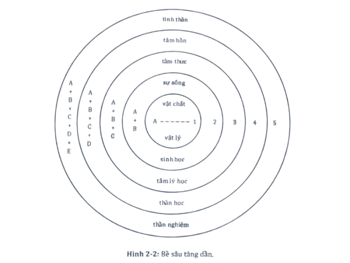 Mỗi cấp độ bao hàm cái trước nó, sau đó bổ sung thêm những thuộc tính mới đặt khởi của riêng nó, những thuộc tính không thể được tìm thấy trong các chiều kích trước đó. Thế nên mỗi chiều kích sau sẽ “lớn hơn” theo nghĩa bao hàm nhiều hơn, nhiều bề sâu hơn. Và ta sẽ thấy cấu trúc của cá thể toàn/ bộ thực chất nới rộng ra để bao hàm càng lúc càng nhiều Hoàn Vũ – như được thể hiện chính xác trong hình 2-2.